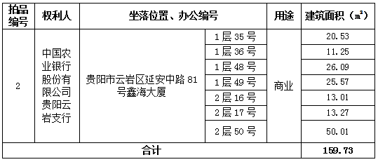2、貴陽市云巖區(qū)延安中路81號(hào)鑫海大廈1層35、36、48、49號(hào)及2層16、17、50號(hào)商業(yè)房地產(chǎn)(總建筑面積:159.73㎡)。