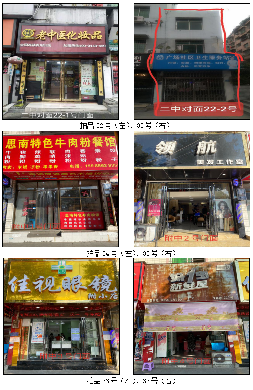 1.拍品22至28號(hào)標(biāo)的位于銅仁市中級(jí)人民法院外,面積:19.35——30.86㎡,租賃期3年(2021.05.01至2024.04.30止),交通便利,其中28號(hào)標(biāo)的包含3個(gè)門(mén)面(市直91號(hào)、92號(hào)和93號(hào))為整體拍租。