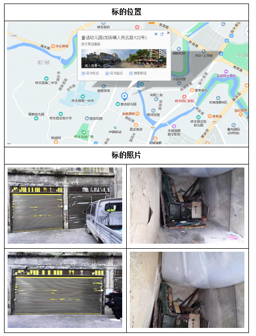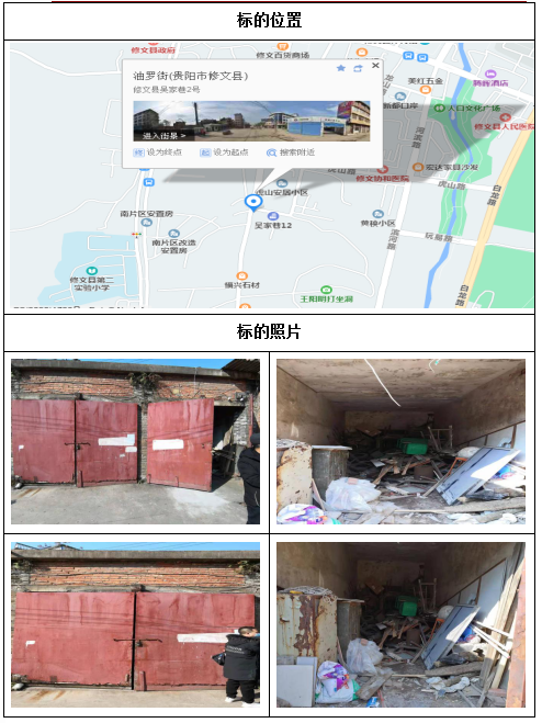 標(biāo)的位于修文縣龍場鎮(zhèn)迎春路52號,建筑面積為30㎡,共兩個獨立車庫。實際用途為車庫,該標(biāo)的東至迎春路,南至小區(qū)道路,西至小區(qū)道路,北至小區(qū)道路;建筑結(jié)構(gòu)為磚混結(jié)構(gòu),層高約3米,無物業(yè)管理,戶型結(jié)構(gòu)為開間。