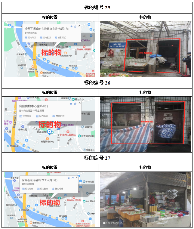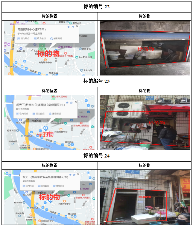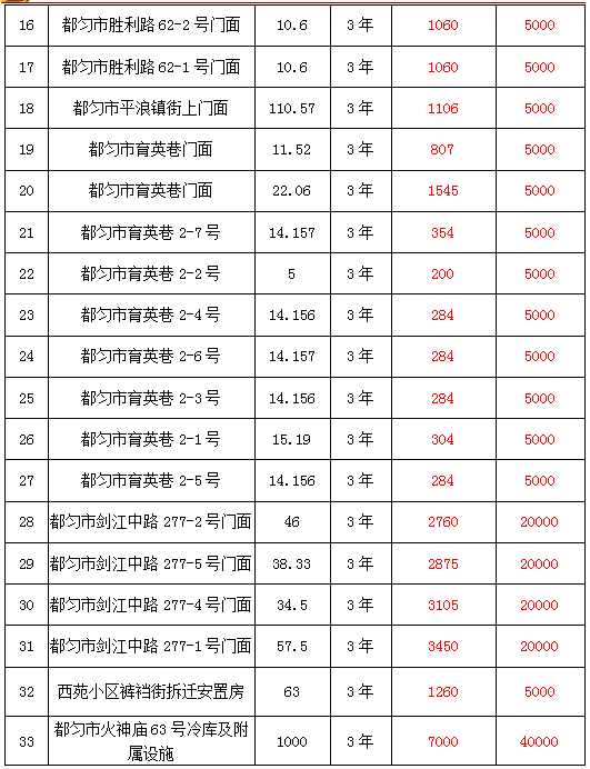 1、都勻市劍江中路、環(huán)東北路、文明路、民族路、勝利路、會(huì)云橋、育英巷等62處門面3年租賃權(quán),面積約5㎡-137.74㎡;