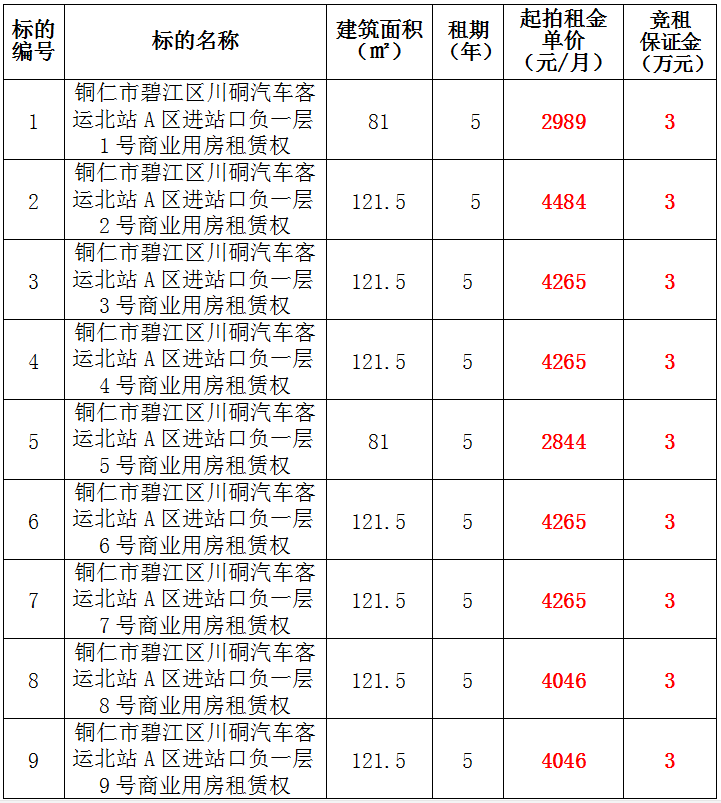 9、銅仁市碧江區(qū)川硐汽車客運(yùn)北站A區(qū)進(jìn)站口負(fù)一層9號(hào)門面租賃權(quán),面積:121.5㎡,租賃期:5年,起拍租金單價(jià):4046元/月,競租保證金:3萬元。