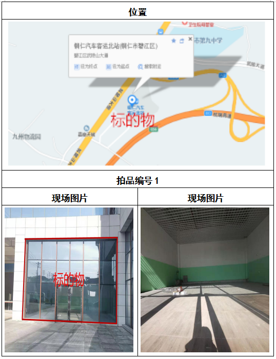 拍品1號(hào)-9號(hào)標(biāo)的位于銅仁碧江區(qū)川硐汽車客運(yùn)北站A區(qū)進(jìn)站口負(fù)一層1-9號(hào)的商業(yè)房地產(chǎn),位于銅仁市中心以北,銅仁汽車北站安置旁,建筑面積分別為:81㎡、121.5㎡、121.5㎡、121.5㎡、81㎡、121.5㎡、121.5㎡、121.5㎡、121.5㎡,租賃期5年,該標(biāo)的位置交通便利,人流量大。