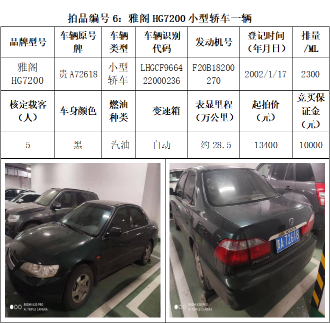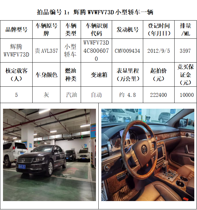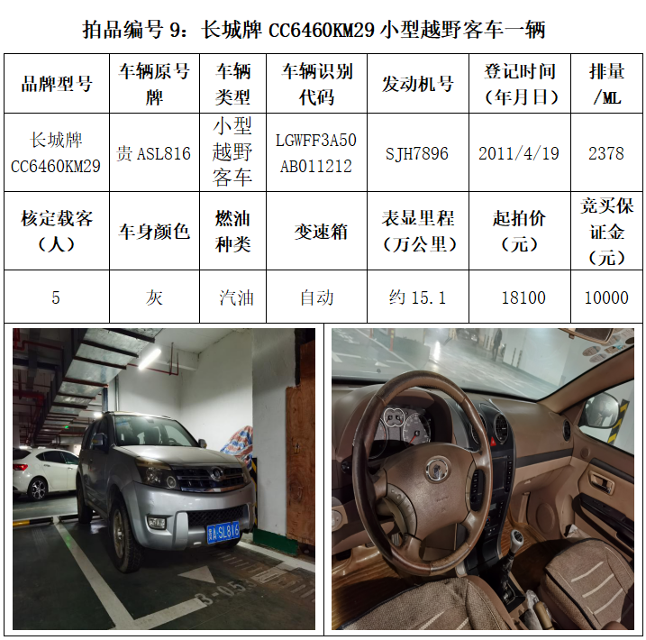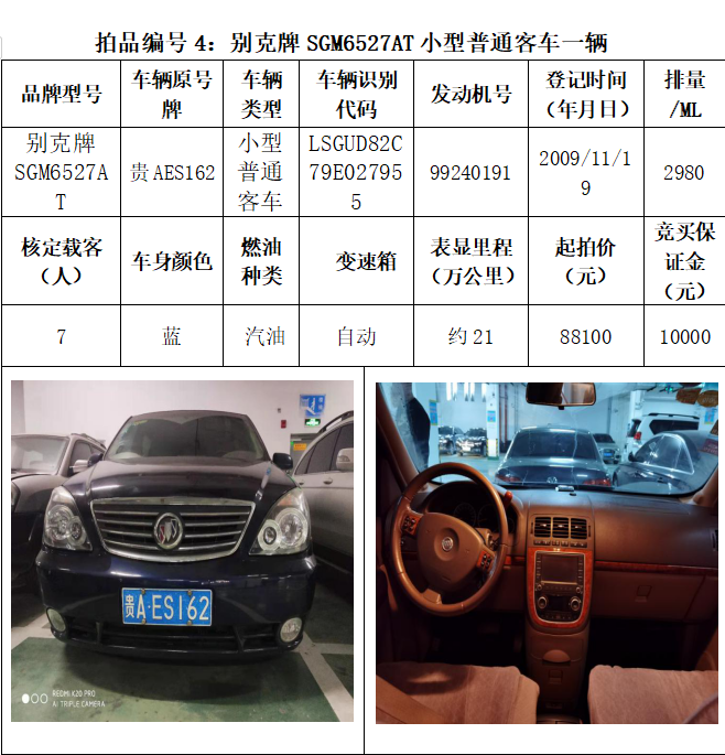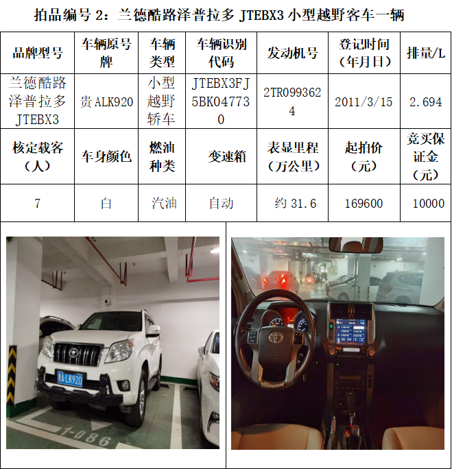 受委托,本公司定于2021年3月26日(星期五)下午14:30時,在貴陽市中華南路20號新大陸數(shù)碼廣場10樓D座拍賣廳公開拍賣以下車輛:普拉多越野車1輛、超級維特拉越野車1輛、別克商務旅行車1輛、輝騰轎車1輛、途勝越野車1輛、雅閣轎車2輛、奧迪轎車1輛,長城牌小型越野客車1輛,共計9輛車。