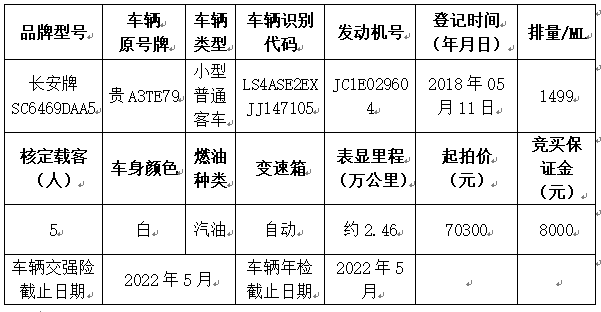 一、拍賣標的:長安牌SC6469DAA5小型普通客車一輛。