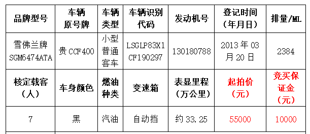 一、拍賣標(biāo)的:雪佛蘭牌SGM6474ATA小型普通客車2輛、豐田牌GTM7200GBNAVI小型轎車1輛、昊銳牌SVW7189BJD小型轎車1輛、三菱牌CFA2031G小型越野客車1輛、帕薩特牌SVW7203FPI小型轎車1輛,共六輛。