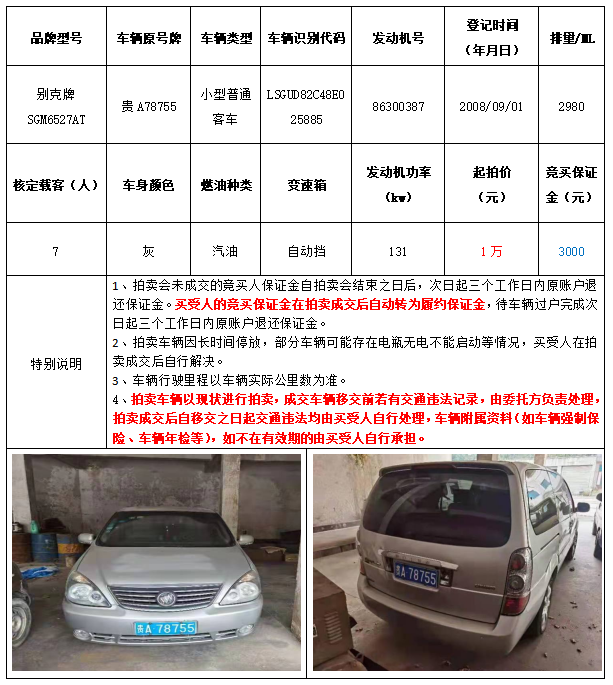 別克牌SGM6527AT小型普通客車1輛,起拍價1萬元。