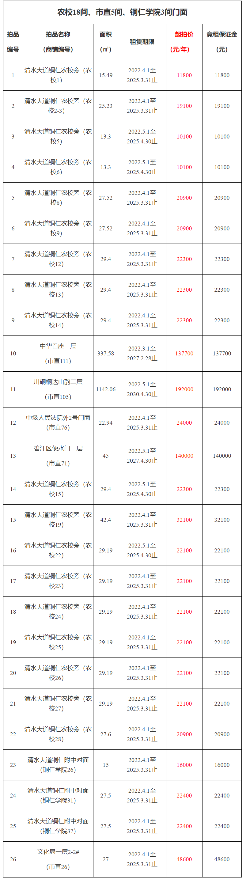 21、清水大道銅仁農(nóng)校旁(商鋪編號:農(nóng)校27),面積:29.19㎡,租賃期:3年,起拍價:22100元/年,競租保證金:22100元;