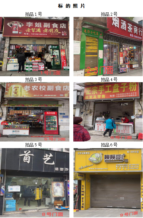 拍品1至9號標的:位于清水大道銅仁農(nóng)校旁,地理位置優(yōu)越,屬于黃金大道。附近有大專、中學、小學、幼兒園等,教學配套齊全;擁有眾多小區(qū),人口流動能力強,固定人口較多;周圍有超市、商場,人口流動性強。地理位置優(yōu)越,屬于臨街門店,升值空間較大;地區(qū)基礎設施完善,公共交通、公共停車設施的增加,使該地升值空間進一步增大;建筑結構:磚混,面積:13.3㎡至29.4㎡不等(具體面積見上表),租賃期3年(具體日期見上表),保養(yǎng)情況:較好。