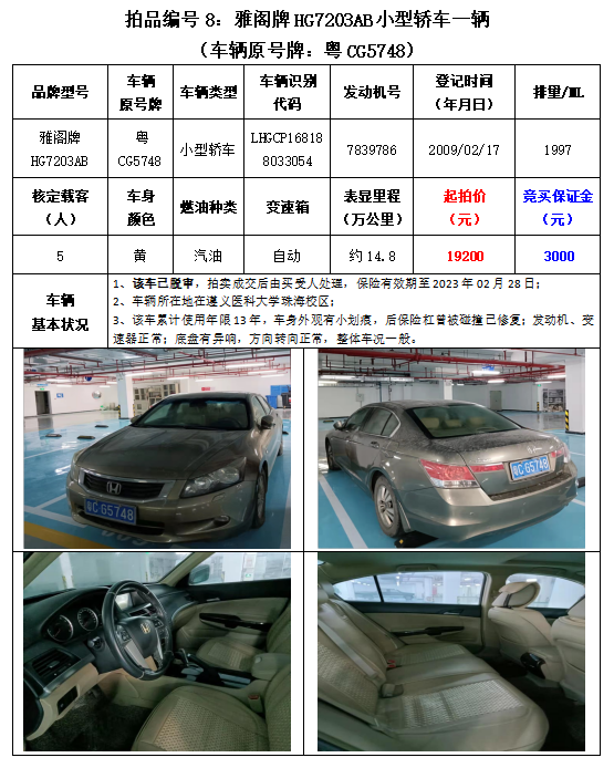 7、雅閣牌HG7203AB小型轎車1輛;