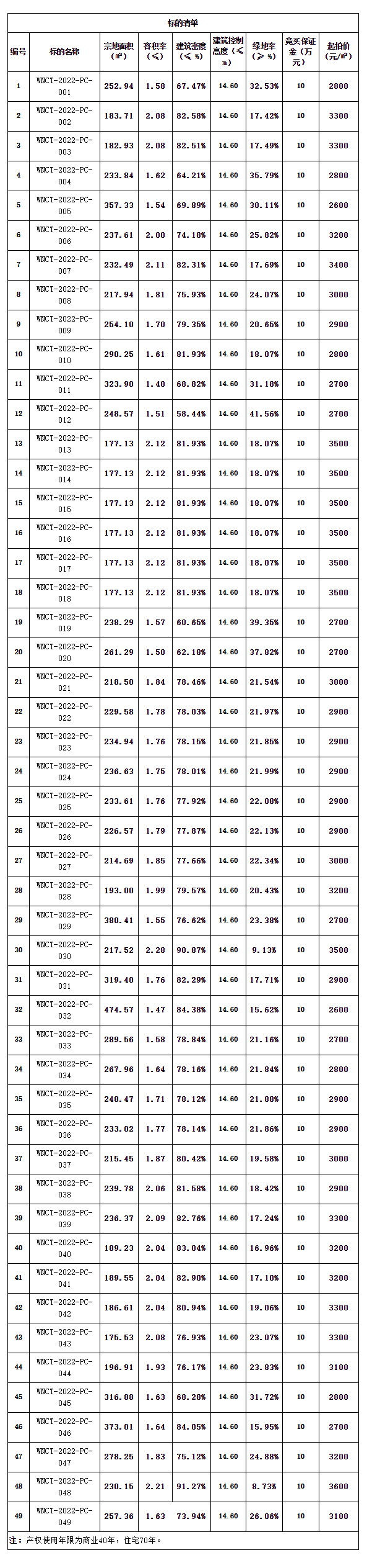標(biāo)的位于畢節(jié)市威寧彝族回族苗族自治縣陽光大道加油站旁,地處威寧縣政府東北方向,距威寧縣政府約1.6公里;該批土地共計49塊,用地面積175.53㎡-474.57㎡,總面積11881.48㎡,所有宗地均為商住用地,使用年限:商業(yè):40年,住宅:70年。