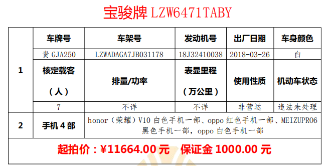 標的一:貴GJA250寶駿牌730小型汽車一輛、honor(榮耀)V10白色手機一部、oppo紅色手機一部、MEIZUPRO6黑色手機一部,oppo白色手機一部。起拍價:11664.00元,保證金:1000.00元。