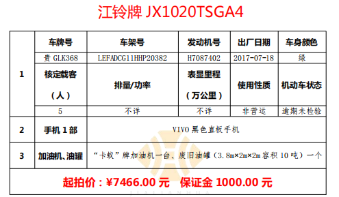 標的二:貴GLK368 江鈴牌輕型貨車一輛、“卡蟻”牌加油機一臺、廢舊油罐(3.8m×2m×2m容積10噸)一個,VIVO黑色直板手機一部。起拍價:7466.00元,保證金:1000.00元。