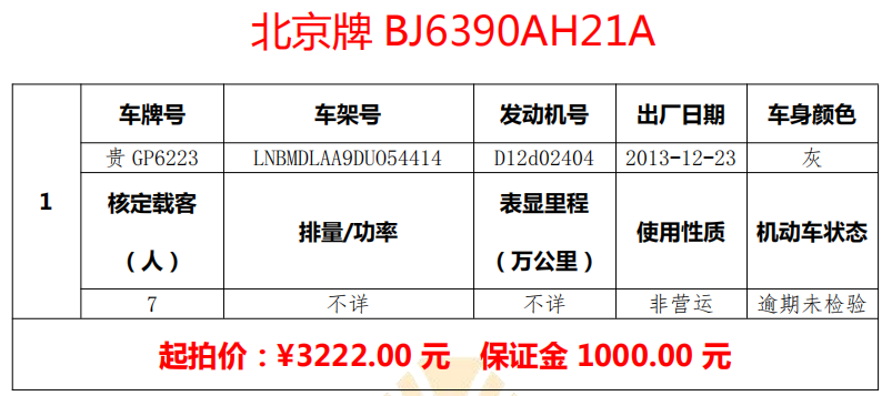 標的三:貴GP6223北京牌小型面包車一輛。起拍價:3222.00元,保證金:1000.00元